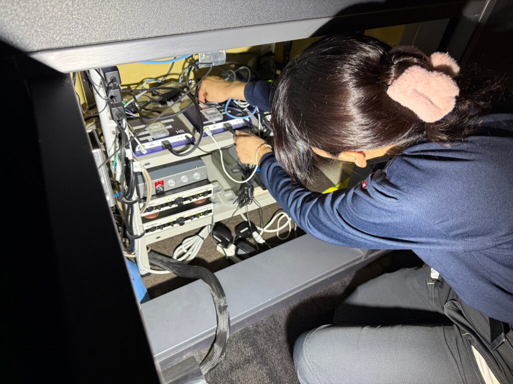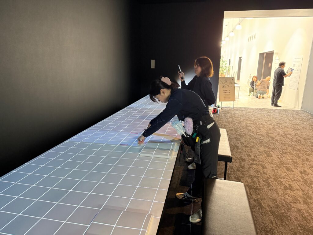 過去にお納めしたプロジェクションマッピングの画角補正を行いました。このシステムは天井に設置した3台のプロジェクターでテーブル天面に投影しています。テーブルには、本の立体造形があり、そこにマッピングを行っています。